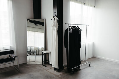 Yes! We have a magnetic hook placed high on the wall to keep your dress wrinkle-free and photo-ready. There’s also a clothing rack in the main space and two additional hooks in the bathroom for extra storage.